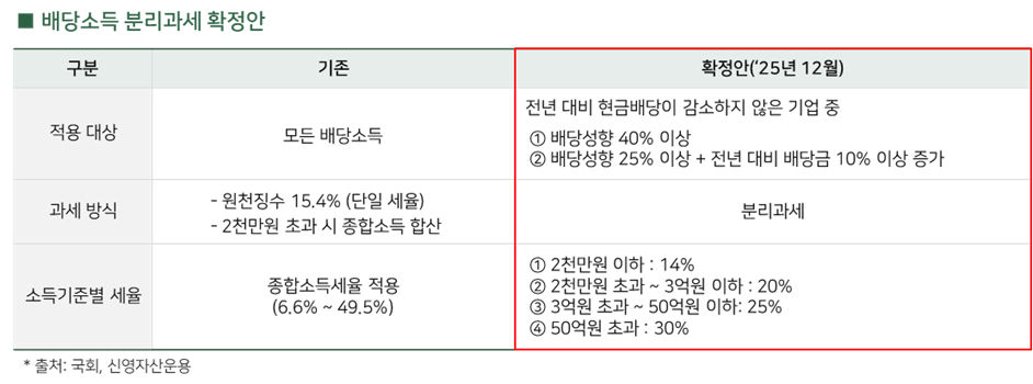 2026년부터 고배당 상장기업의 주주가 받는 배당소득에 대해 다른 소득과 분리하여 낮은 세율을 적용하는 ‘배당소득 분리과세’가 적용됩니다.