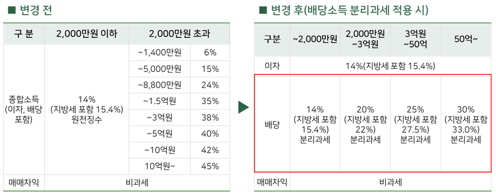 기존에는 배당소득과 이자소득의 합이 연간 2,000만원을 초과하면 모든 소득을 합산하여 누진세율 최고 49.5%을 적용했어요.